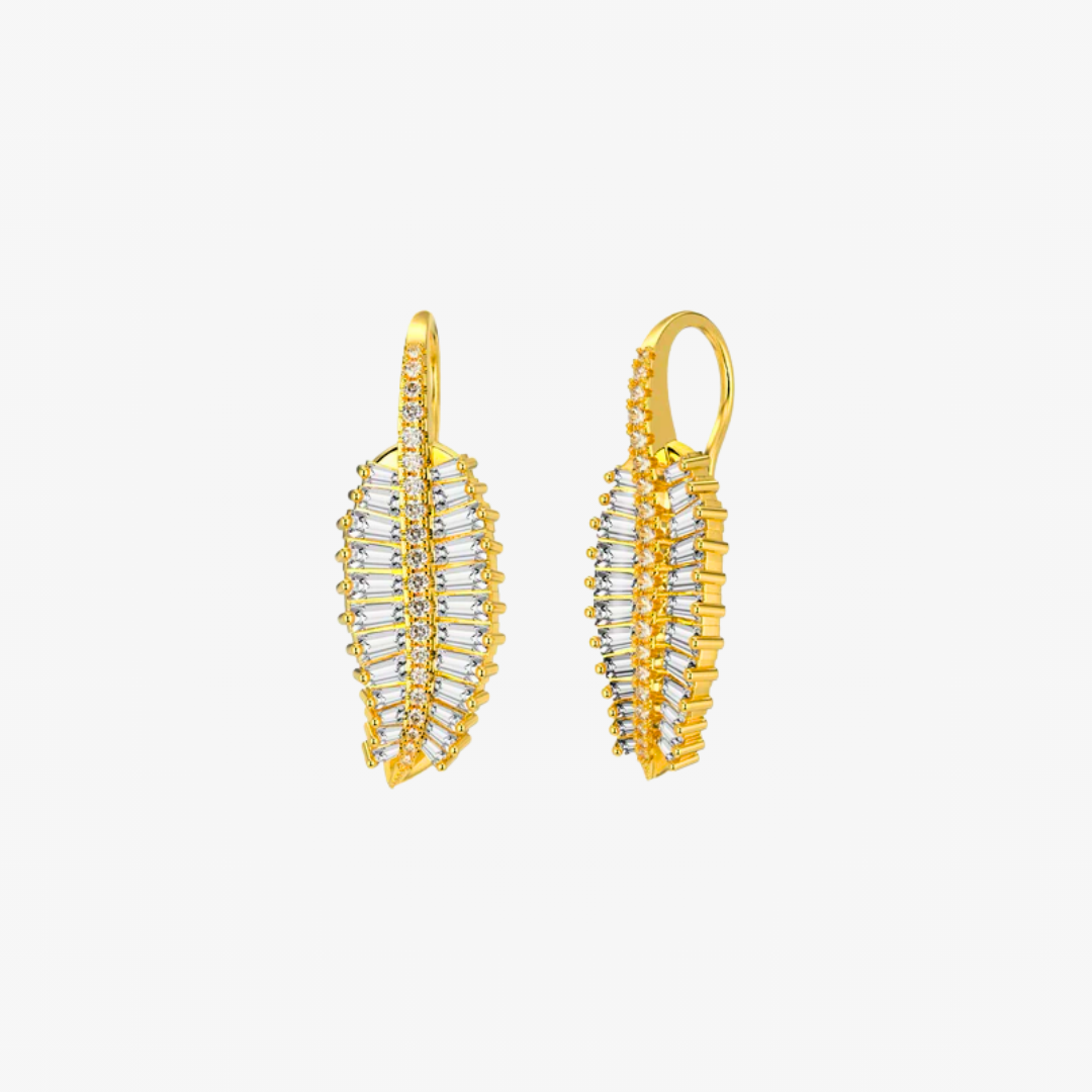 Als een tak versierd met dauwdruppels in de ochtendzon, omhelst Feather je oren met subtiele elegantie. De verfijnde blaadjes, bezet met fonkelende zirkonia’s, vangen het licht bij elke beweging en stralen een natuurlijke en tijdloze schoonheid uit.