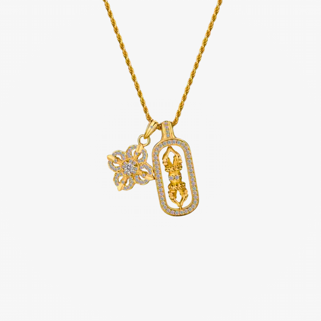 De langwerpige hanger, die doet denken aan een fijn flacon of amulet, straalt een gevoel van verborgen betekenis en innerlijke kracht uit. De gedetailleerde bloembedel voegt een element van schoonheid en spirituele groei toe aan het ontwerp. Beide elementen zijn subtiel met elkaar verbonden en schitteren prachtig aan de gedraaide gouden ketting.