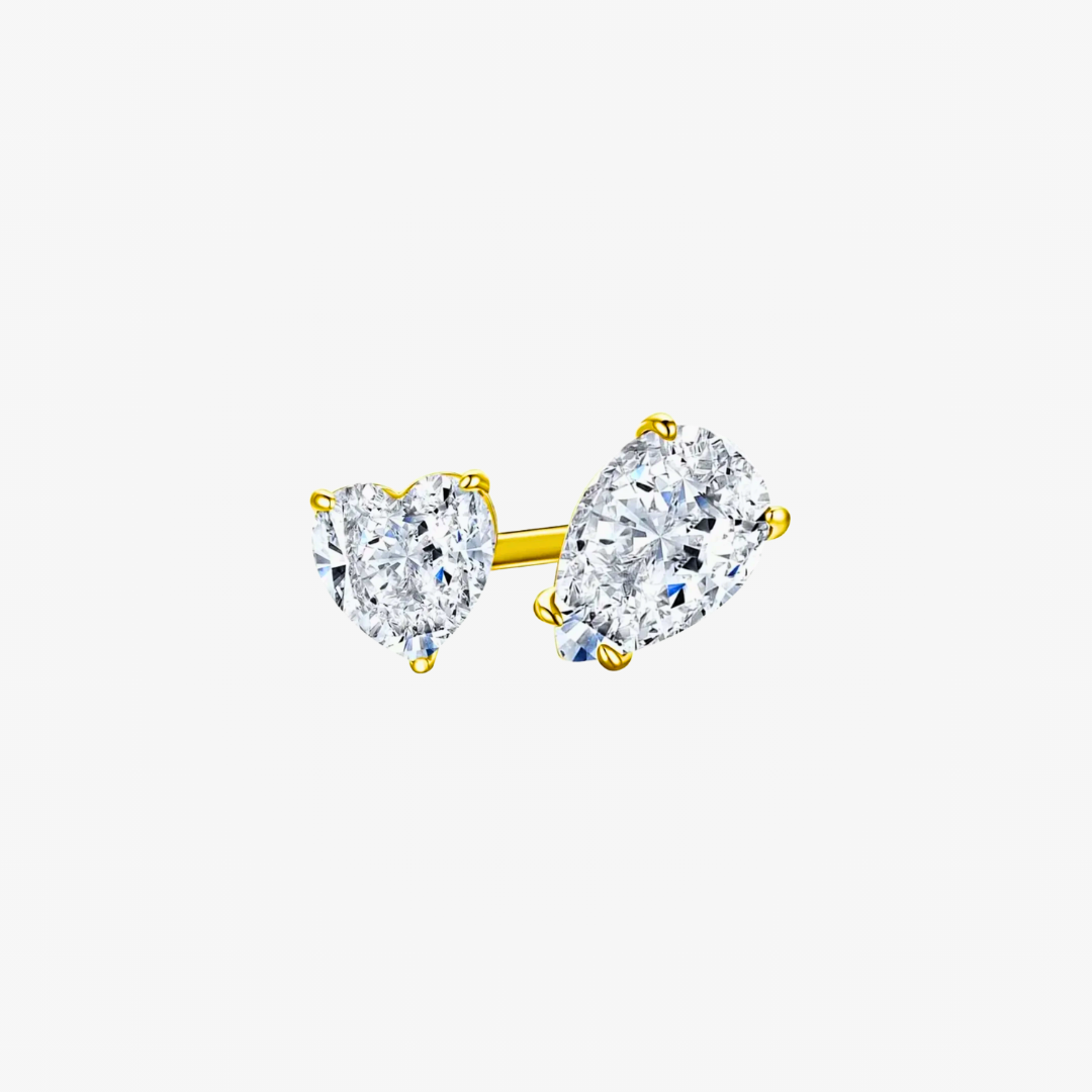 De Sophie Ring is een statement van verfijnde asymmetrie en moderne elegantie. Deze unieke ring is verguld met 18k goud en schittert met twee opvallende stenen: een fonkelende hartvormige moissaniet en een elegante peervormige moissaniet. De combinatie van deze twee verschillende slijpvormen creëert een dynamische en toch harmonieuze uitstraling.