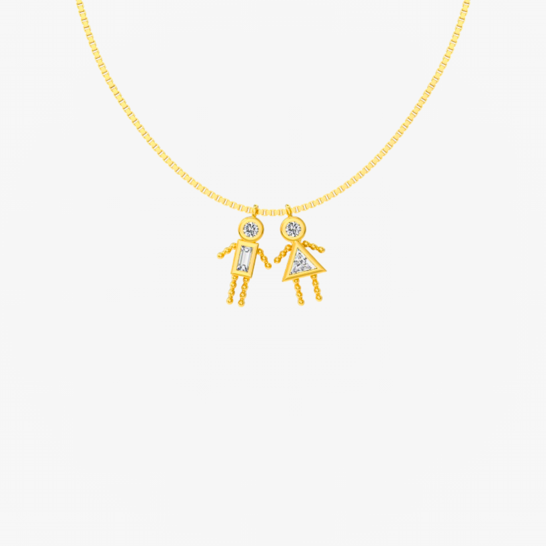 Het ene figuurtje heeft een rechthoekig lichaam met een zirkonia accent, terwijl het andere figuurtje een driehoekig lichaam met zirkonia’s heeft. Beide hebben een rond hoofdje met een fonkelende zirkonia in het midden en kleine bolletjes als armen en benen. Ze zijn verbonden door hun handen die elkaar stevig vasthouden. De fijne, maar stevige gouden ketting benadrukt de symbolische hanger op elegante wijze.